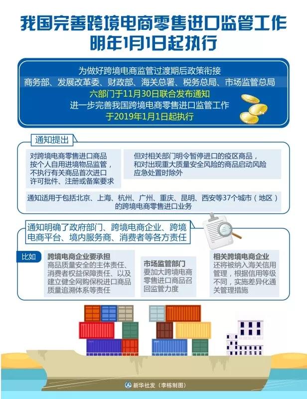 为做好跨境电子商务零售进口(以下简称跨境电商零售进口)监管过渡期后政策衔接,促进跨境电商零售进口健康发展,六部门近日联合发布通知,进一步完善我国跨境电商零售进口监管工作,并于2019年1月1日起执行。